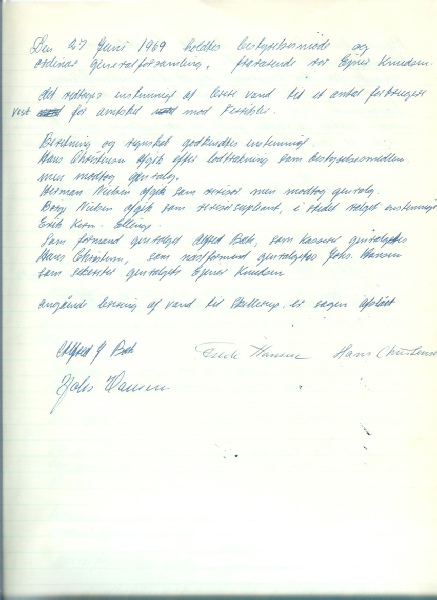 Den 27 Juni 1969 holdtes bestyrelsesmøde og ordinær generalforsamling, fraværende var Ejner Knudsen.